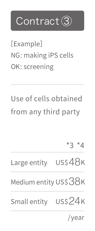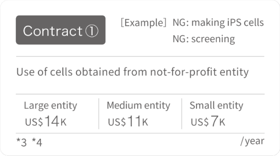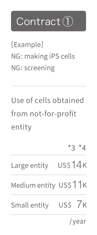 | Pharmaceutical company Company C wants to use iPS cells obtained from a not-for-profit organization or iPS cells purchased from one of our licensees on the market for its internal research to conduct drug screening. |