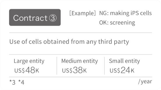 | Company C wants to use iPS cells obtained from a not-for-profit organization or iPS cells purchased from one of our licensees on the market for its internal research to conduct drug screening. | ||